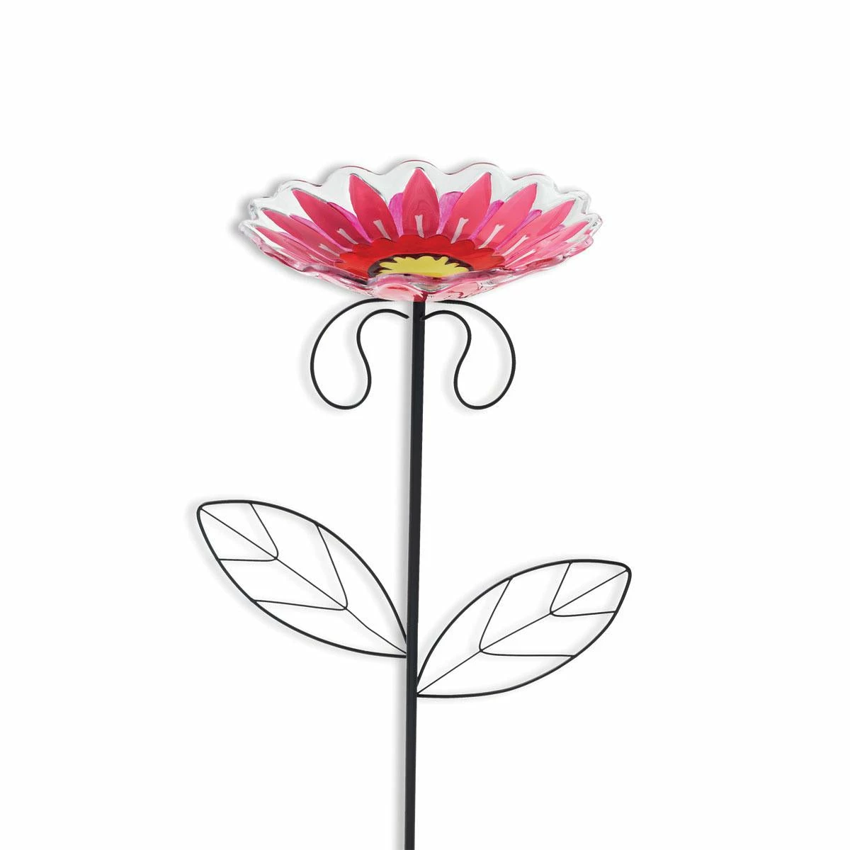 Glass butterfly feeder/bath includes sponge, nectar, special recipe card and Butterfly Tips Brochure. Comes with black powder coat stake with ground prongs for stability. Place among flowers in the garden or near a leaf mister to create a butterfly haven in your garden!